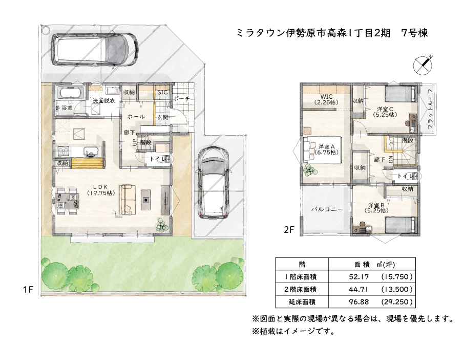 | 敷地面積 | 実測148.76m²(44.99坪) | 建物面積 | 壁芯96.88m²(29.25坪) |