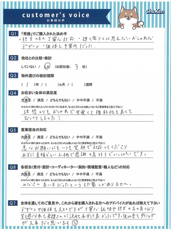 デザインや価格も大切ですが、丁寧な説明や担当の方の気くばりなども感じられて秀建さんに決めて本当に良かったです。後は全てタイミングが大事だと思います。