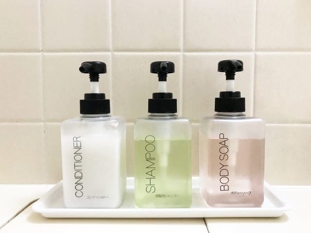 浴室の備え付けの棚や床にシャンプーやBODYソープのボトルを