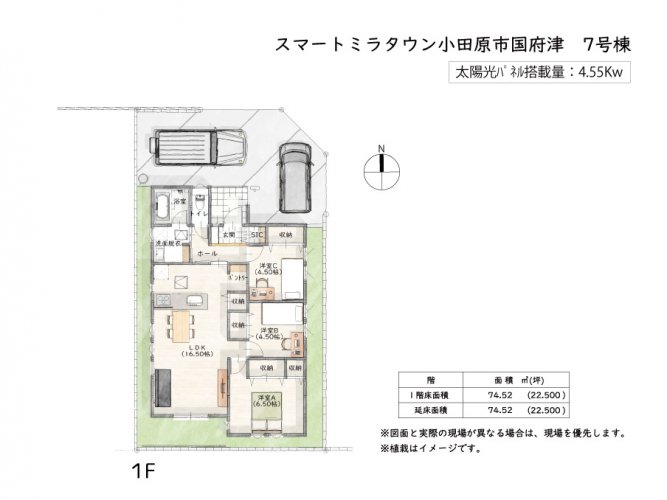 | 敷地面積 | 実測145.1m²(43.89坪) | 建物面積 | 壁芯74.52m²(22.50坪) |
