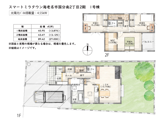 | 敷地面積 | 実測136.64m²(41.33坪) | 建物面積 | 壁芯89.42m²(27.00坪) |