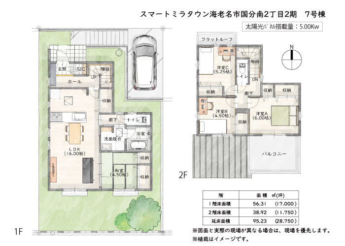 | 敷地面積 | 実測129.99m²(39.32坪) | 建物面積 | 壁芯95.23m²(28.75坪) |