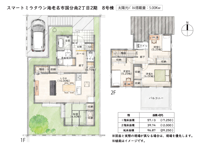 | 敷地面積 | 実測130.42m²(39.45坪) | 建物面積 | 壁芯96.87m²(29.24坪) |
